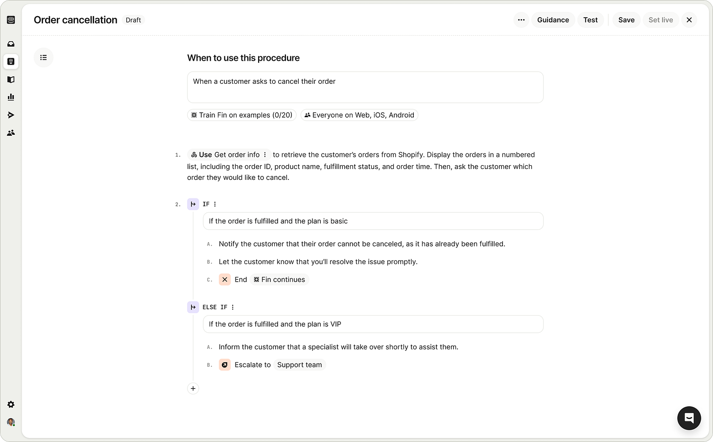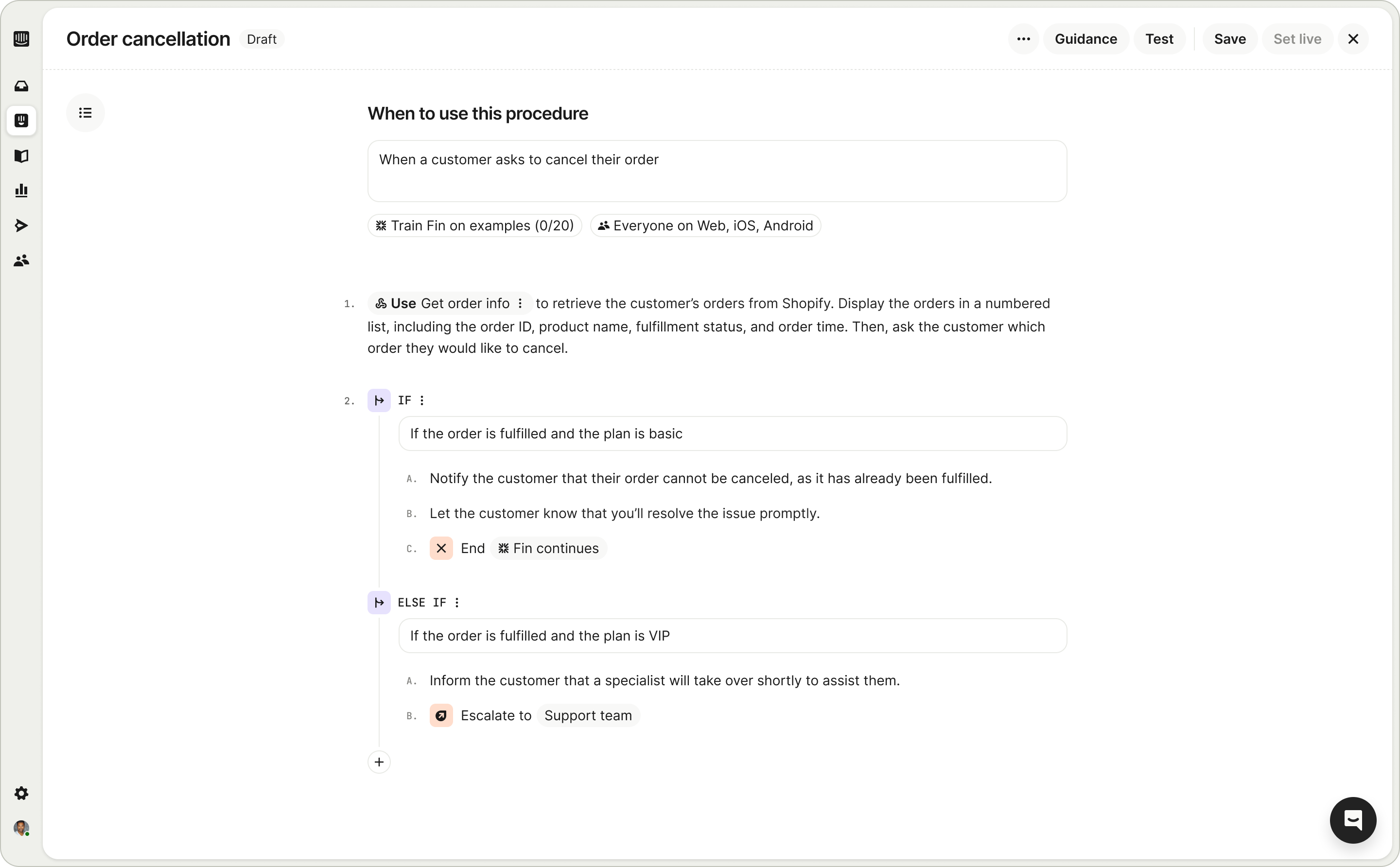 If you’re creating a Fin Procedure, you can start by literally just describing what you want Fin to do in natural language English. But you can then also add deterministic instructions inline, as part of the document itself: Branching Logic for conditional statements, Data Connectors for fetching third-party data, and Code Blocks for when you want a specific expression.