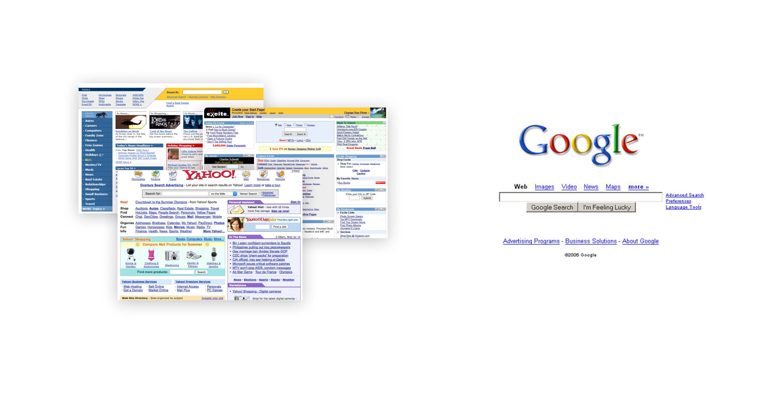 Even though search was their core feature, web portals were more focused on promoting content and advertising, keeping users in a limbo of news, weather, horoscopes—anything for the eyeballs.