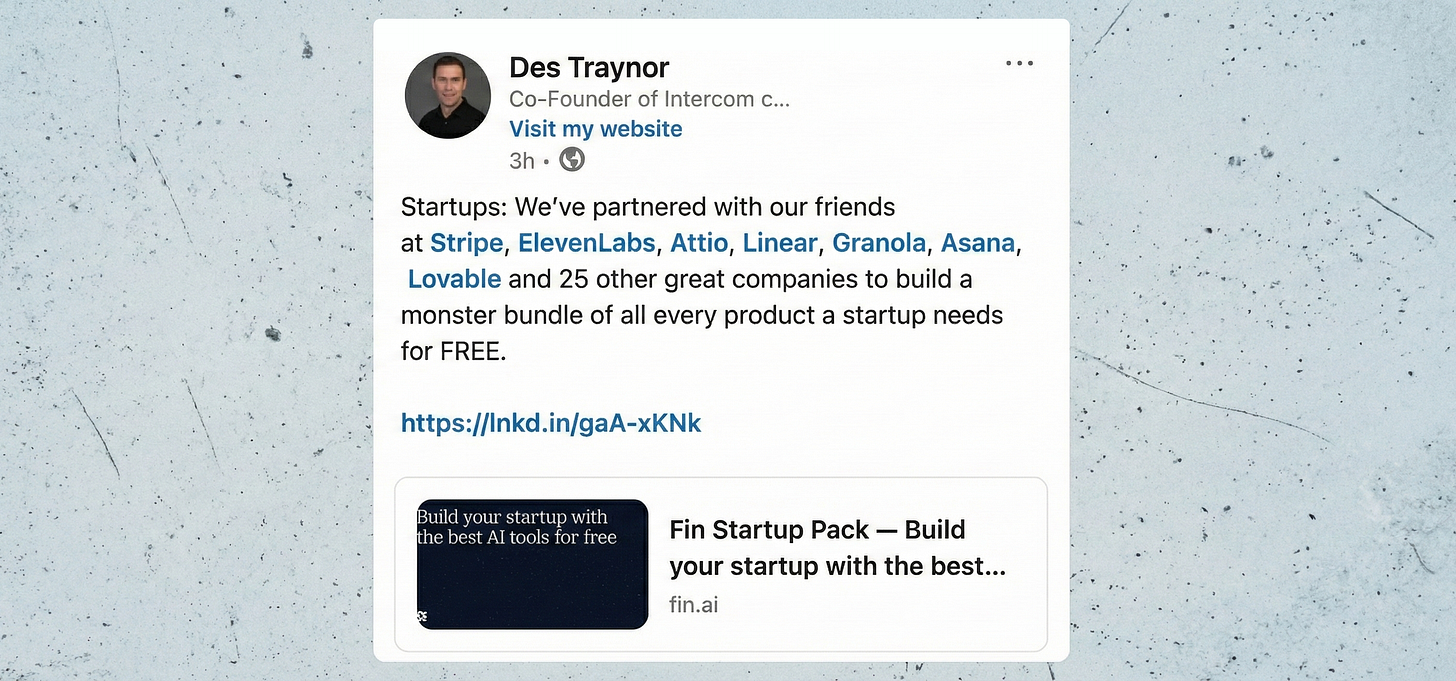 For startups looking for a similar lucky break, we’re announcing the Fin AI Startup Pack. It’s a six-figure gift wrapped with possibilities, granting access to some of the best tools available. Think of it as your chance to take that leap forward, just in time for the holidays.