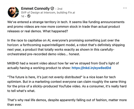 Francesca’s piece captures why this matters — and why real demos have become an act of clarity and credibility in an era of cinematic promises.