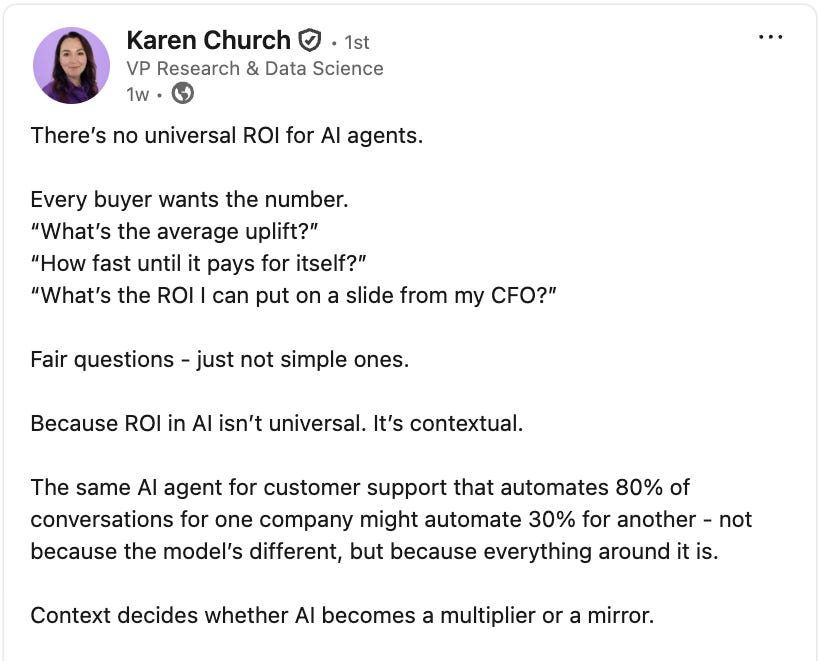 Karen’s answer is simple and sharp: ROI is contextual.