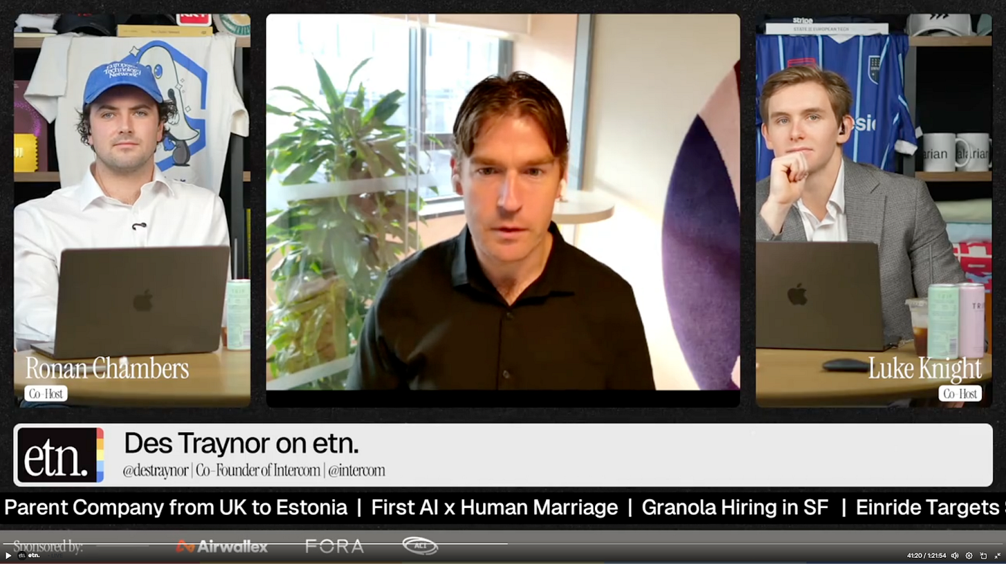 On Thursday, Des joined the ETN tech show (skip to 37:16) to talk about the story of Fin, the state of AI startups in Europe, and the question on everyone’s mind: