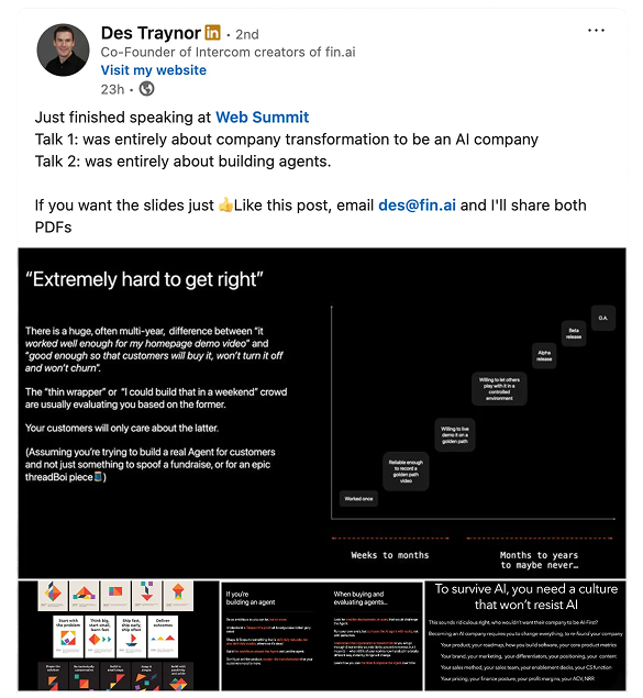He pointed to MKBHD’s recent critique of over-produced demos and contrasted it with what happened at Pioneer, when Paul Adams dialed a real phone number on stage and talked to Fin Voice live.