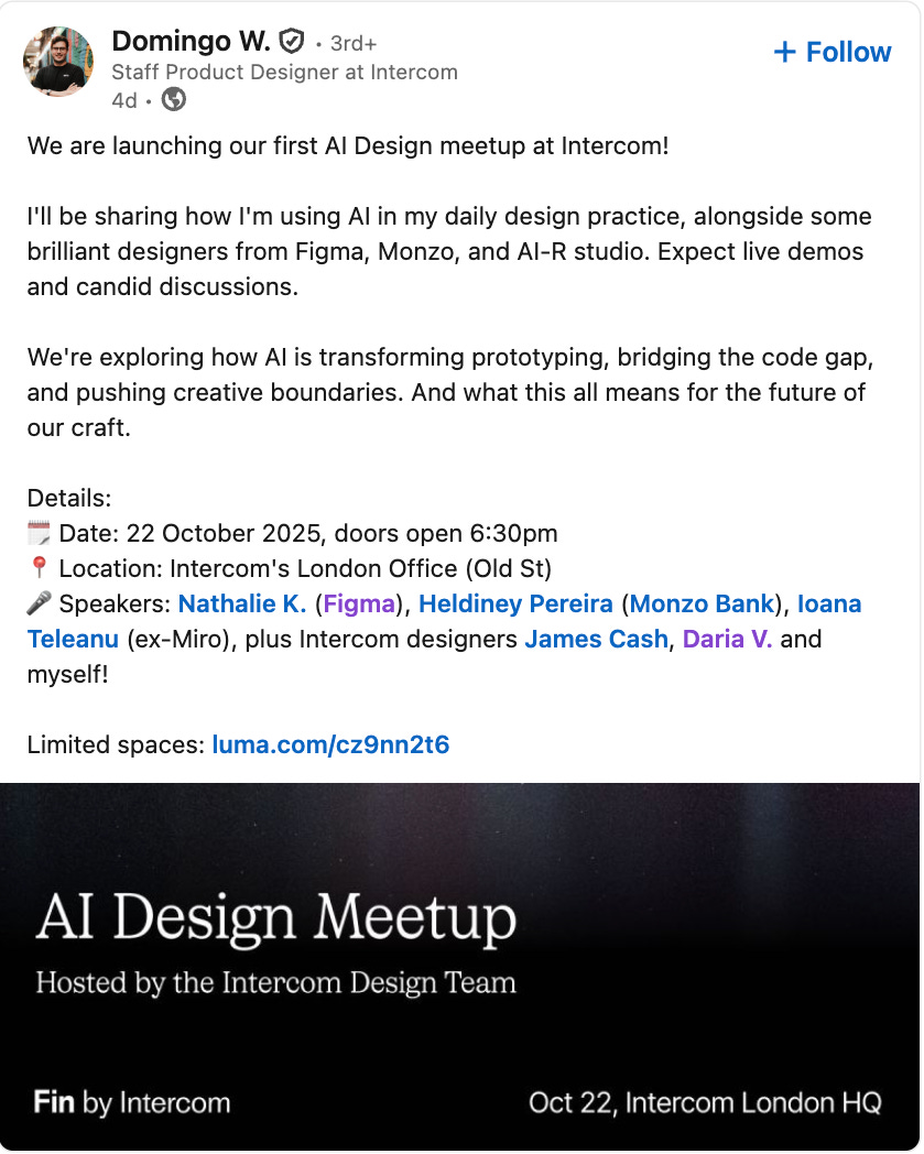 If you’re in London, you can keep the AI-in-design discussion going at our first AI Design meetup on October 22 at the Intercom offices in Old Street.