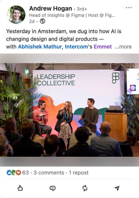 And to spread the message wider, last week he was onstage with Figma in Amsterdam along with several other design leaders for a panel discussion about how AI is changing design: