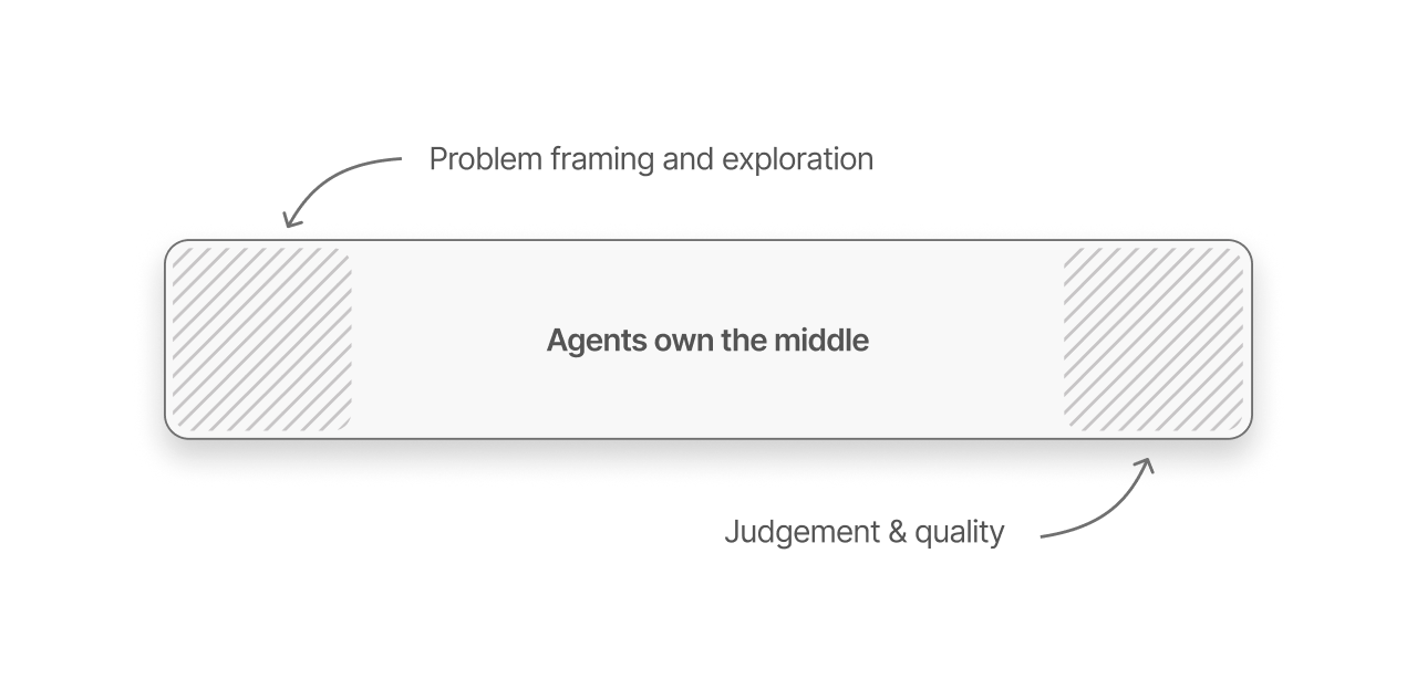Agents will own the middle, the build. Design’s value concentrates at the edges, deciding what to build and then determining whether the output is good enough.