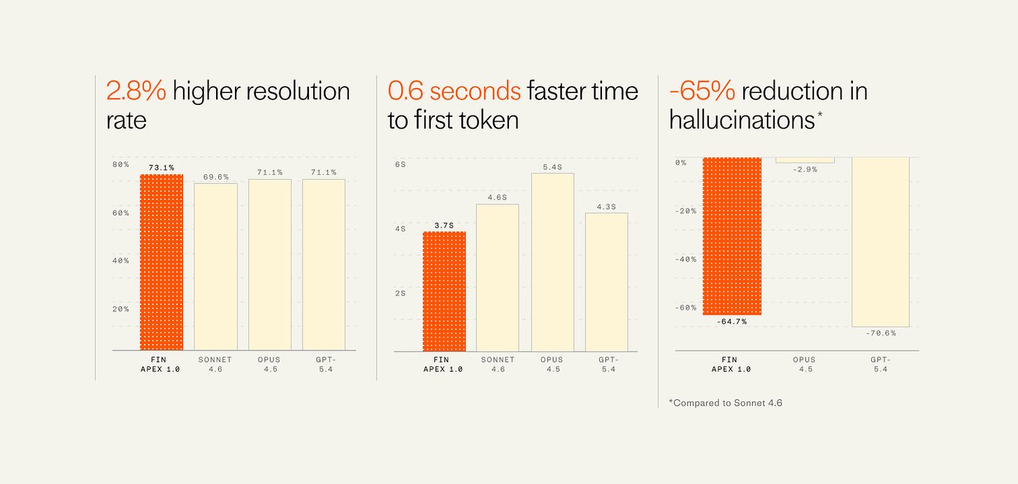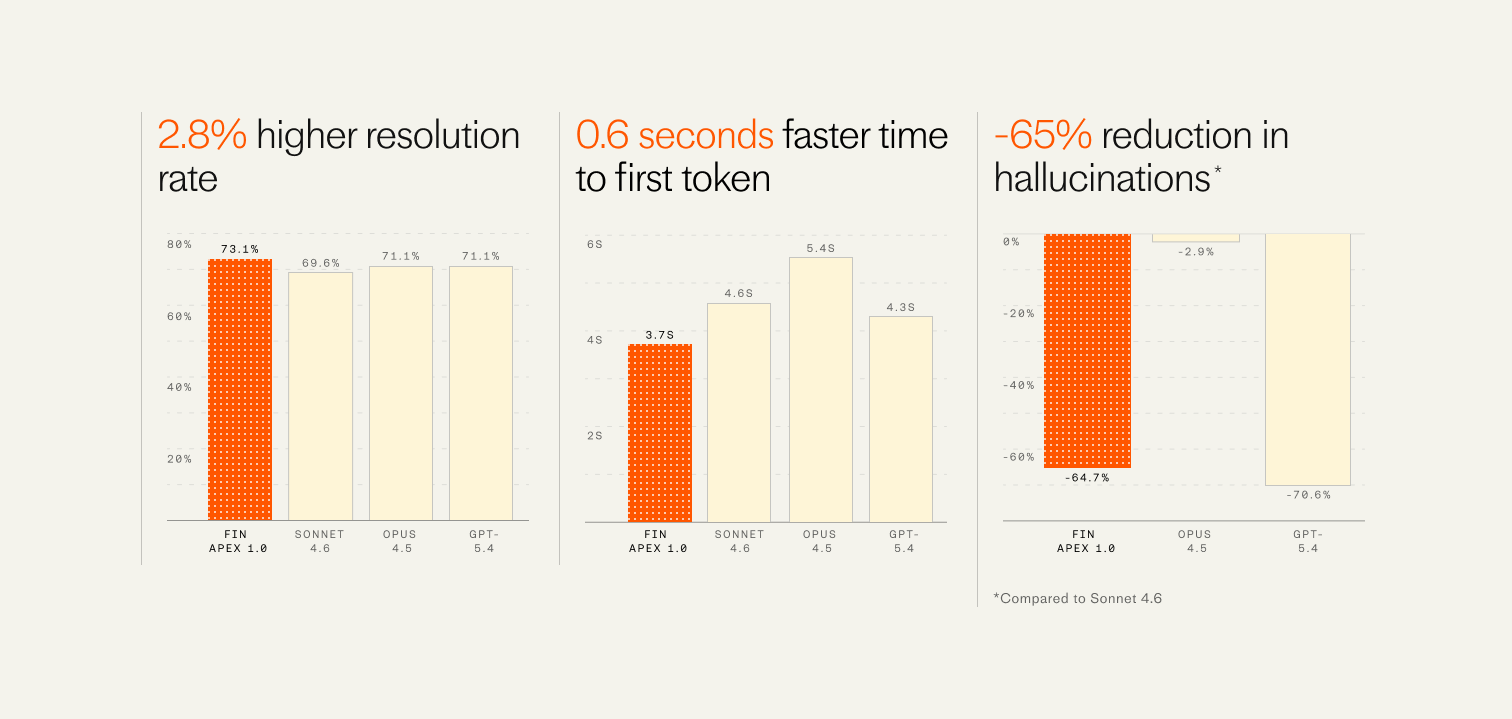 Fin is a customer agent platform that at present resolves over 2M customer issues a week, growing at a rapid exponential pace. It’s relied on by the best brands, large and small, in every vertical you can imagine. From Atlassian and Riot Games, to smaller hot upstarts like Mercury and Polymarket. It runs on a family of models trained by our AI group. Last week, we announced Apex, which is the world’s first specialized customer service LLM. In production tests over the last 6 months, it beat every single frontier model, including those from Anthropic and OpenAI, on resolution rate, latency, hallucination rate, and cost.