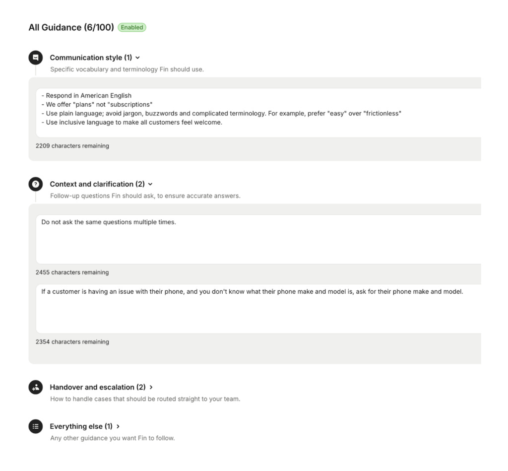 With Fin when we were building our Guidance feature, one thing we realised was that we needed to (ahem) “guide” our users into saying useful things, here’s the interface we ended up building. You’ll be shocked to hear that a lot of what we’re doing here is just forcing our users to be clear about how they want their bot to behave, by asking questions.