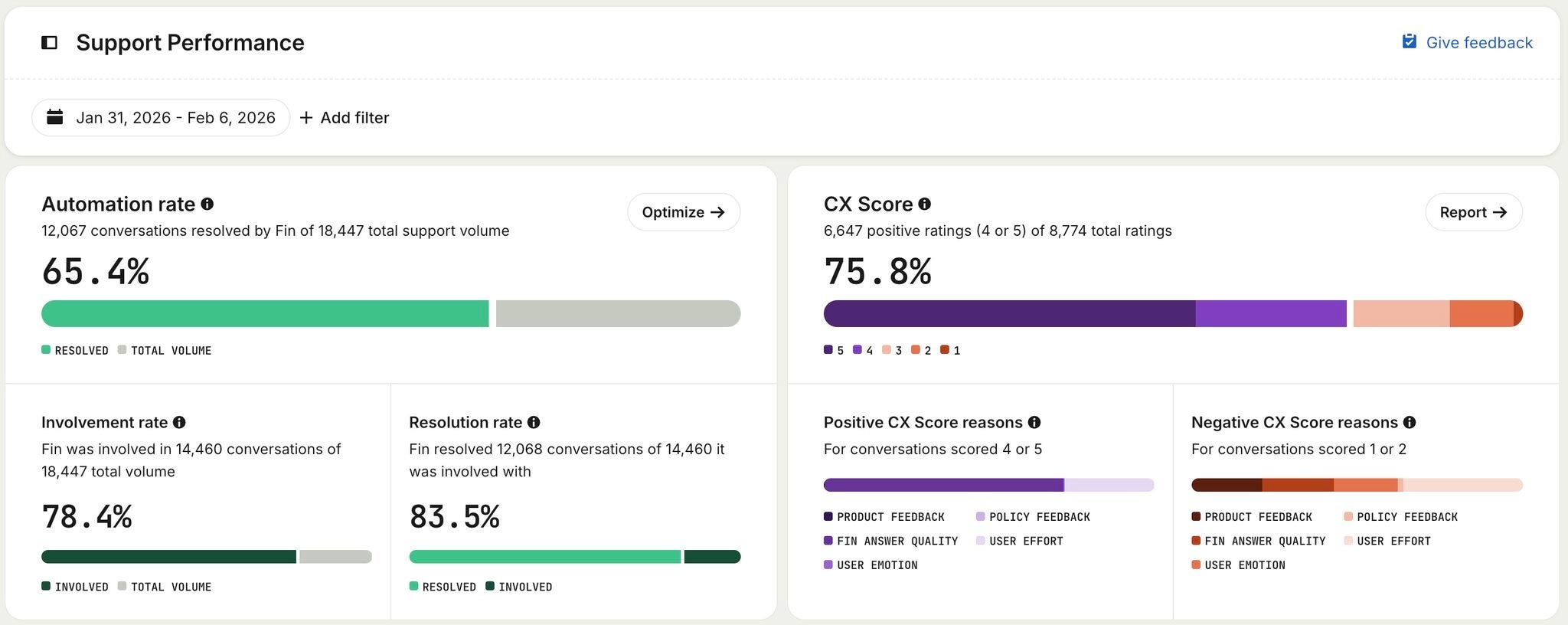 Automation rate (on the left) shows the percentage of all customer conversations Fin resolves end-to-end without human involvement, while CX Score (on the right) reflects the quality of those customer experiences. Together, these metrics provide the best view of both Fin’s effectiveness and the quality of its performance at scale.