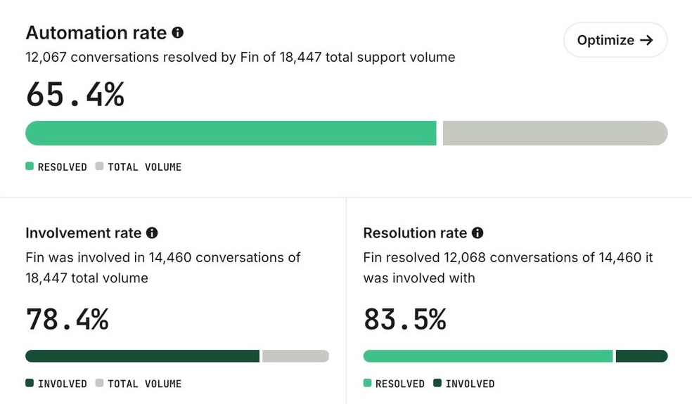 Think of Resolution as the “how well” and Automation as the “how much.” Any gap between them represents pure upside: More conversations Fin can handle and more resources you can save.