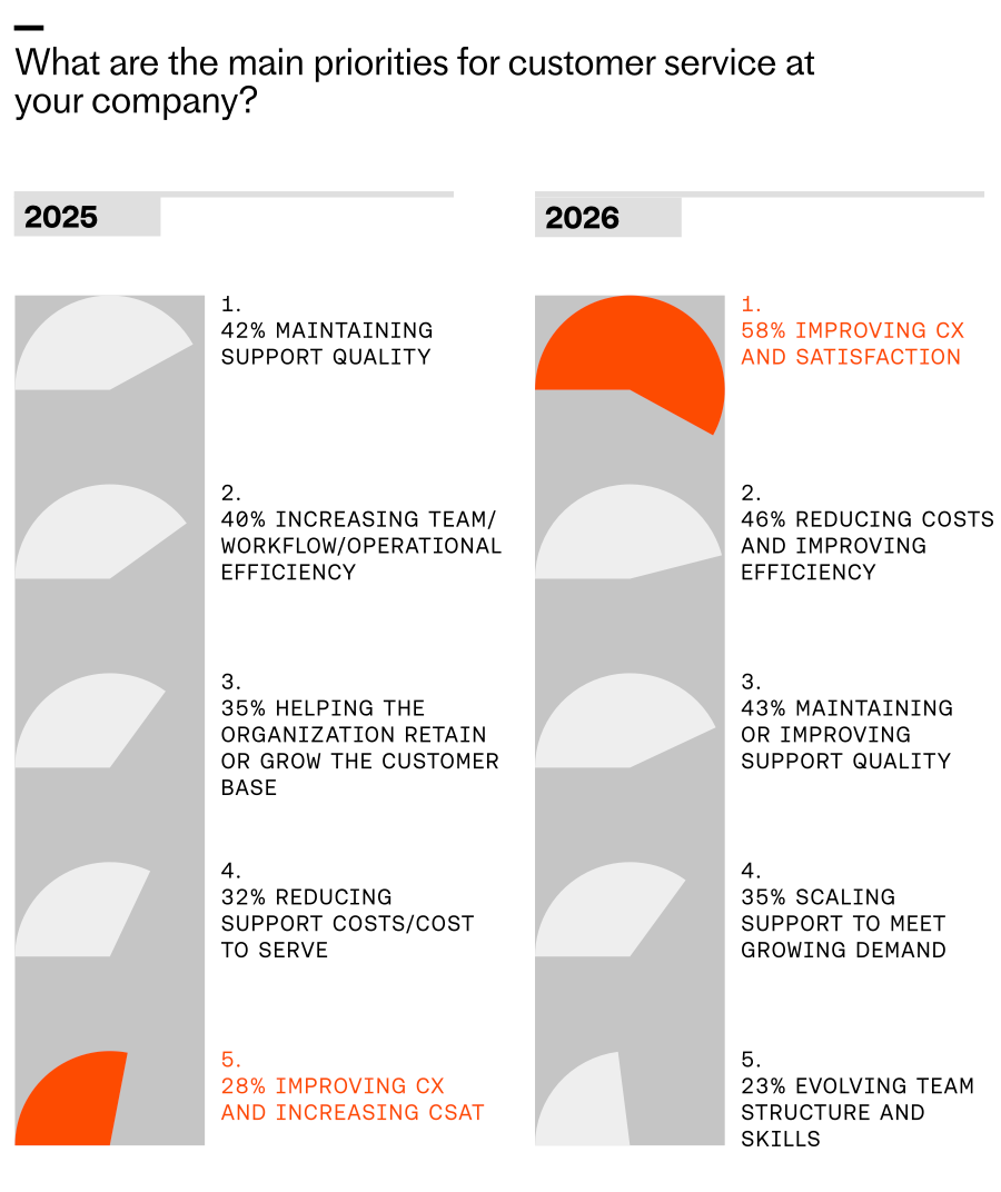 Strategic shift to retention: Support priorities have flipped from “deflecting tickets” to “improving experience,” with 58% of teams now focusing on satisfaction as their #1 goal for 2026.