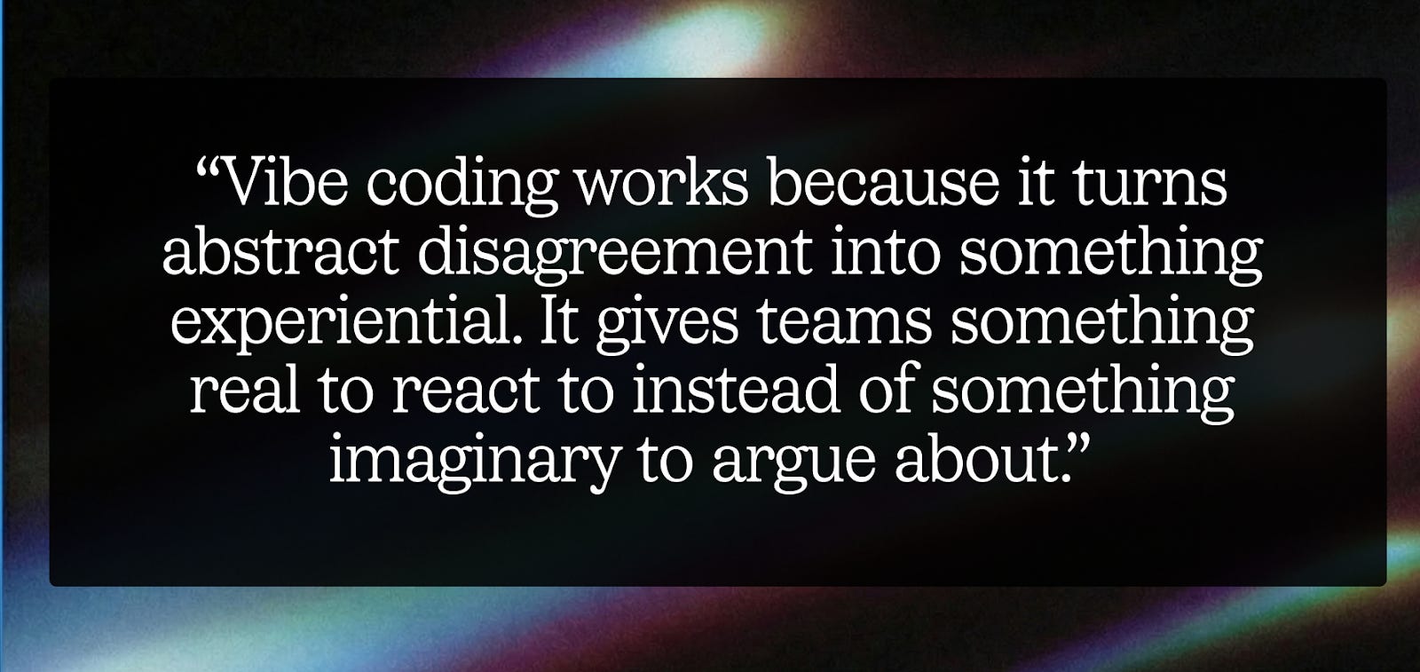 Alignment on whether something is actually valuable, or just impressive. Alignment on whether something is truly feasible, or should be stripped back. Vibe coding works because it turns abstract disagreement into something experiential. It gives teams something real to react to instead of something imaginary to argue about.