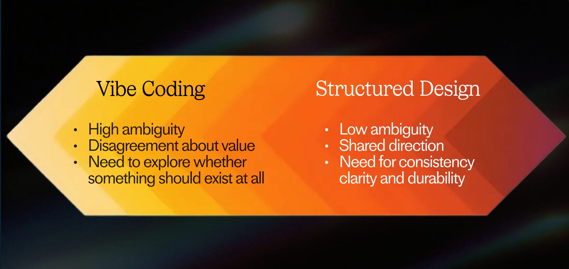 Vibe coding doesn’t replace structured design work—it precedes it. Its job is to collapse ambiguity, not to carry ideas to the finish line. Once direction is clear, the work still needs the rigor of systems thinking, accessibility, and careful specification. Knowing when to switch modes is the skill.