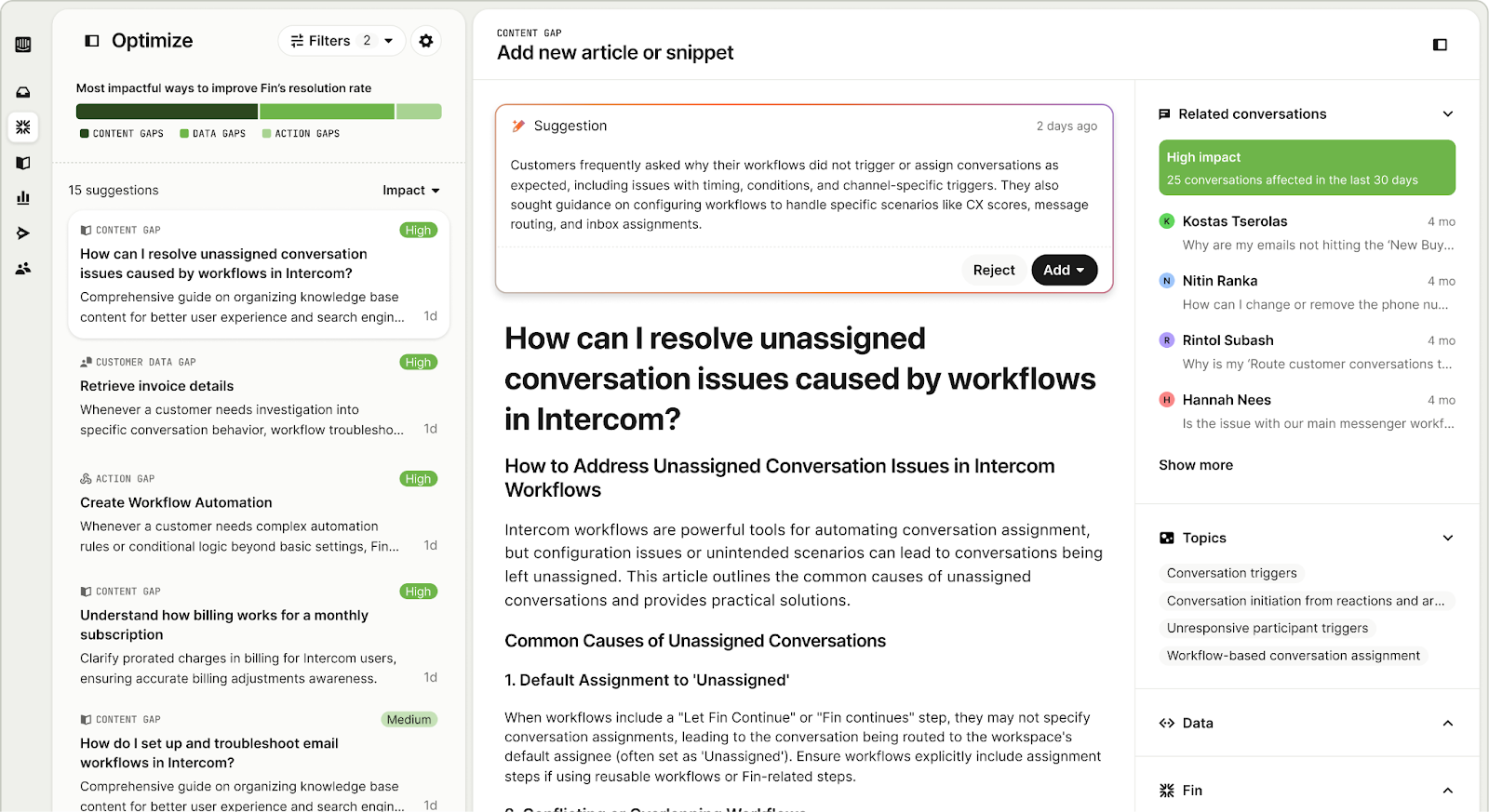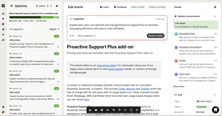 We could look at questions Fin couldn’t answer, see how human agents handled them, identify missing knowledge, and proactively suggest what to add or edit. On the surface, this felt like a killer feature.